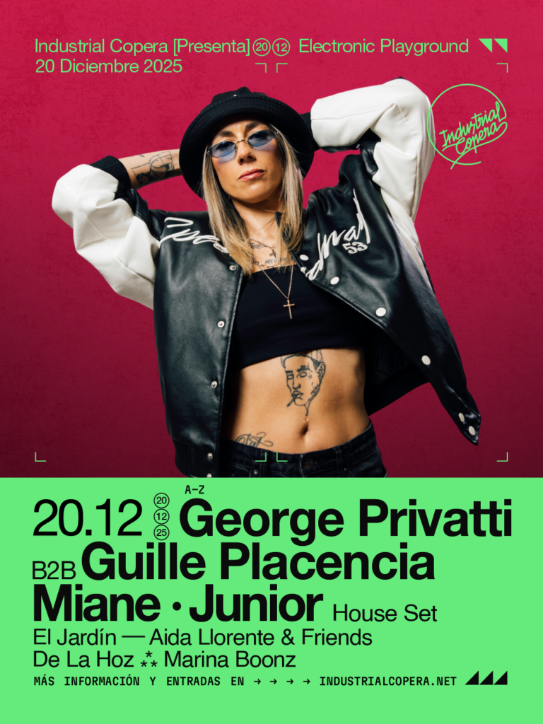 Completa el cartel el siempre eficiente Álvaro Sánchez, un DJ que conoce la cabina de Industrial Copera como la palma de su mano. Además en El Jardín tendremos la oportunidad de gozar con Andrea León y Marien Novi.