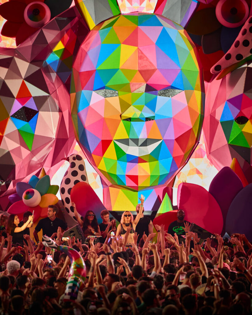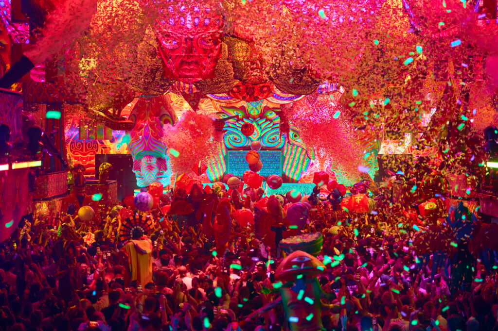 Todo este universo creativo se sostiene sobre una producción de escala monumental. Escenografías 360º, instalaciones interactivas, esculturas gigantes y efectos especiales transforman completamente el espacio, mientras más de 300 artistas en escena (acróbatas, actores, bailarines y performers itinerantes) interactúan de forma constante con el público. Miles de piezas exclusivas de vestuario, máscaras y props, creadas a mano en los talleres propios de elrow, junto a explosiones de color, confeti, inflables y transiciones en vivo, mantienen la experiencia en movimiento permanente.