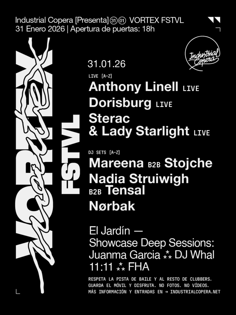 Para el último mes de enero regresa VORTEX FSTVL, una jornada maratoniana con un line up que te volará la cabeza gracias a una propuesta de techno y experimentación con los lives de Anthony Linell, Dorisburg y Sterac & Lady Starlight