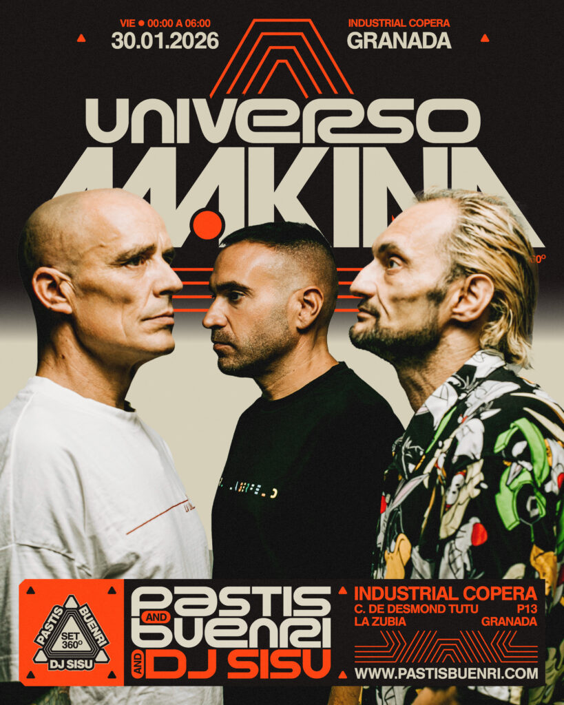 Prepárate para Universo Makina (Granada), una experiencia efímera, única e irrepetible. Un legendario trío de DJs (Pastis, Buenri y DJ Sisu) llega con un nuevo formato. Un nuevo Universo, una gira que marcará un antes y un después en la escena de la música electrónica en España. Por primera vez, estos iconos de la música Makina se embarcan en un tour exclusivo por todo el país. Ofrecerán una sesión especial a tres bandas con una cabina triple en formato triangular y en medio de la pista.