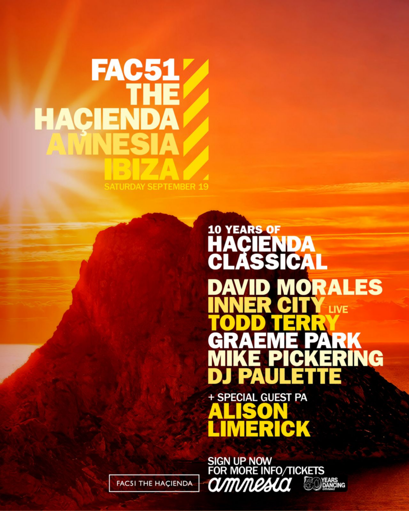 Llevando este concepto a Amnesia, el cartel conecta generaciones de música house: David Morales, los legendarios Inner City de Detroit en formato live, el pionero de Brooklyn Todd Terry, el histórico residente de TheHaçiendaGraeme Park, el cofundador Mike Pickering y DJ Paulette, además de una actuación especial de Alison Limerick, la voz detrás del himno generacional “Where Love Lives”.