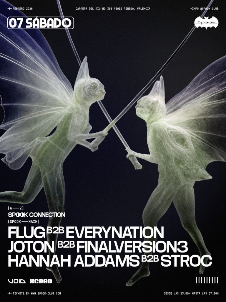 Spook Connection es una de las fiestas más especiales del templo valenciano, ya que nos da la posiblidad de disfrutar de los residentes realizando sets colaborativos con invitados especiales. En esta ocasión podrás deleitarte con Main: Joton B2B Finalversion3 + Flug b2b Everynation + Hanna Adams b2b Stroc