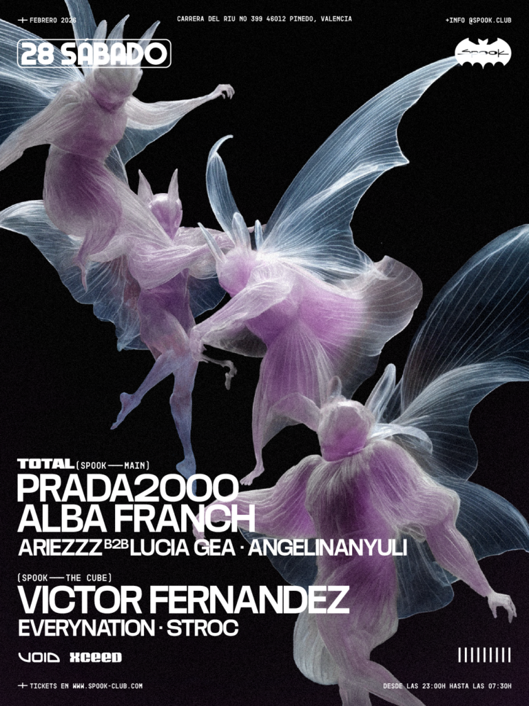 Para la última fecha de febrero, llegará a Spook Prada2000, un nombre en alza en la escena internacional, conocido por sus sets llenos de energía que mezclan melodías trance, voces divertidas y líneas de bajo animadas. Su sonido es rápido, divertido y emotivo, siempre pensado para mantener al público completamente cautivado. Alba Franch es una joven DJ de Madrid cuyos sets irradian energía, carácter y una genuina pasión por la música. Completan el cartel en la Main, Ariezzz b2b Lucia Gea y Angelinanyuli. En la sala Cubo pincharán Victor Fernandez, Everynation y Stroc.