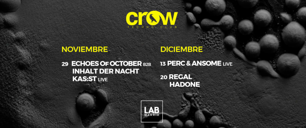 Recta final de año corta pero intensa para Crow Techno Club, que descansa hasta el 29 de noviembre, noche en la que traerá como gran propuesta el directo del dúo parisino Kas:st con un techno que bascula entre la oscuridad y la pura emoción. Antes, y en formato back to back aparecerán el misterioso berlinés Echoes of October y Inhalt Der Nacht. A buen seguro, ambos aprovechará la ocasión para desempolvar sus hits EBM, cold wave y new wave.