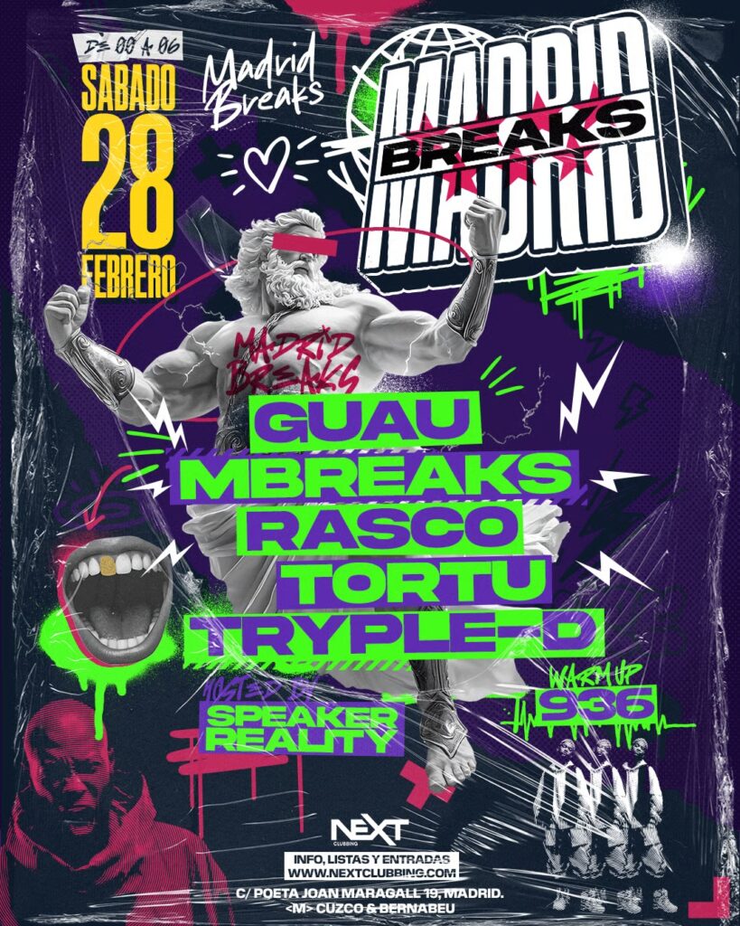 Tras el rotundo éxito de la primera edición en Next Club, el auténtico ritmo andaluz regresa a Madrid el 28 de febrero para volver a romper la pista. Una noche donde el breakbeat, la energía del sur y el espíritu underground se dan la mano. Grooves contundentes, basslines sin concesiones y una atmósfera pensada para bailar sin frenos. Madrid Breaks no es solo una fiesta, es una conexión directa con la cultura break, una celebración del sonido que nunca se fue y que ahora vuelve más fuerte que nunca.