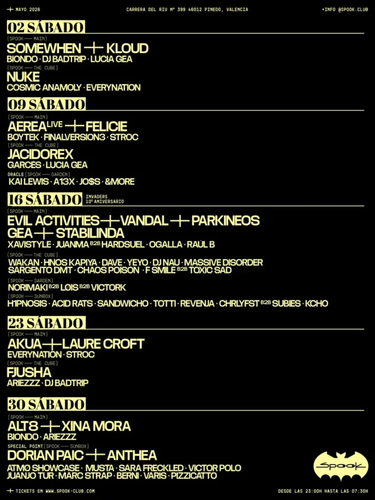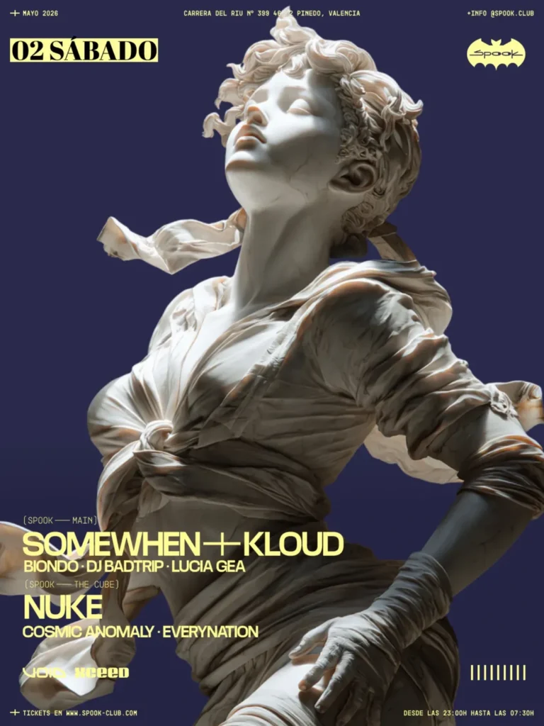 El mes de mayo comienza en la Main de Spook con Somewhen, una figura clave de la nueva generación del techno en Berlín, redefiniendo el género para una era posmoderna. Su propio nombre encarna la fusión entre futurismo y nostalgia, reflejando un futuro incierto pero esperanzador. También destaca la presencia de KLOUD, un productor y artista electrónico que fusiona sonidos electrónicos atemporales con elementos de producción modernos; con una identidad sonora inspirada en el techno/house más oscuro, el electro y los sintetizadores analógicos. Completan el cartel Biondo, DJ Badtrip y Lucia Gea.