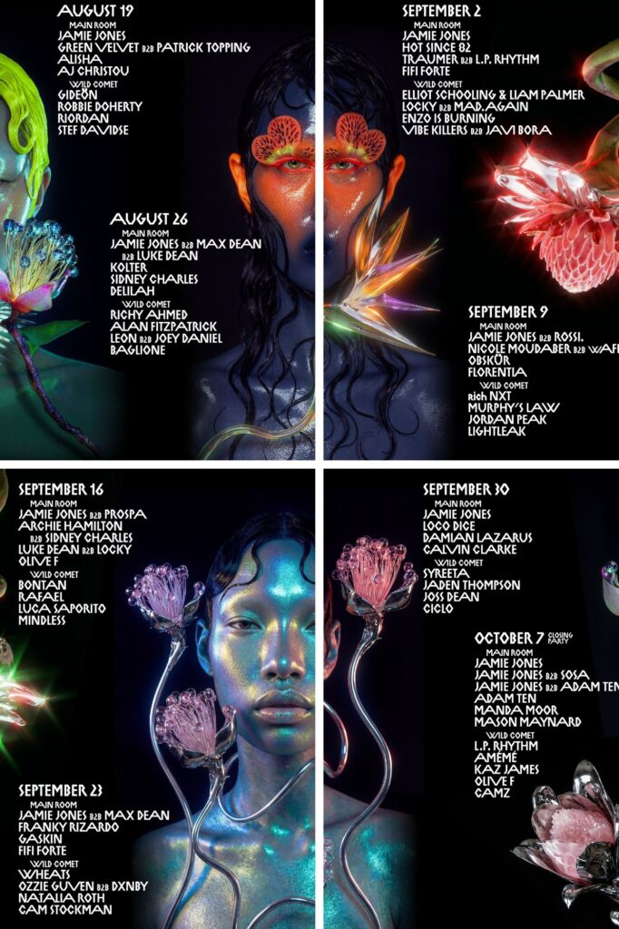 Arranca el mes el 5 de agosto en la Main Room con Jamie Jones B2B Chris Stussy, Archie Hamilton B2B Fleur Shore y Joe Rolét. Y en Wild Comet el talento se abrirá paso con Manda Moor, Seb Zito, Late Replies y Marian. El 12 de agosto en la Main Room será el turno de Jamie Jones B2B Loco Dice, Hot Since 82, Chelina Manuhutu y Antss, escoltados en Wild Comet por Elliot Schooling & Liam Palmer, Mad.Again, Joey London Style y Flowfat.