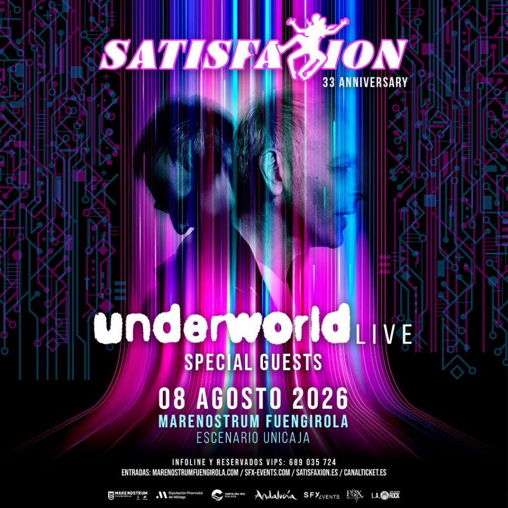 Cuando Satisfaxion anunció en sus redes que algo importante se estaba cociendo, no nos engañaban para nada. Hoy han anunciado a bombo y platillo que su próximo evento en Marenostrum Fuengirola estará encabezado por la legendaria banda Underworld. Un concierto que tendrá lugar el 8 de agosto de 2026, una cita ineludible para los amantes del sonido electrónico más auténtico.