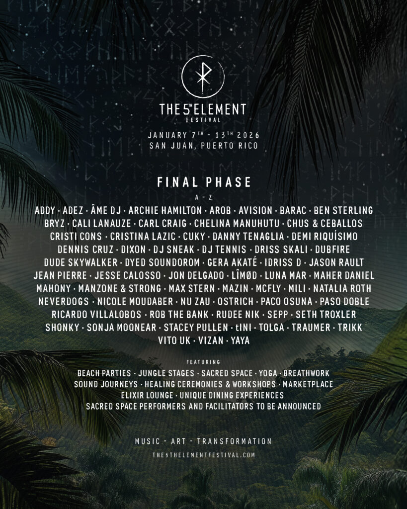 El 5th Element Festival completa su cartel inaugural con un monumental anuncio de fase dos, añadiendo más de 40 artistas a su celebración transformadora de siete días en Puerto Rico. Programado del 7 al 13 de enero de 2026, en múltiples localizaciones de San Juan, Isla Verde y Río Grande, el festival revela ahora todo el alcance de su visión, fusionando a las voces más respetadas de la música electrónica underground con un santuario de bienestar diseñado para nutrir cuerpo, mente y espíritu. La fase dos introduce al pionero del techno de Detroit Carl Craig, a las leyendas del house Chus & Ceballos, al icónico Danny Tenaglia, al titán del tech-house Paco Osuna, y al referente de Detroit Stacey Pullen, junto a los cabezas de cartel previamente anunciados: Dixon, Ricardo Villalobos, Seth Troxler, Nicole Moudaber, Âme, Dubfire y tINI. Los abonos de 7 días y los paquetes exclusivos de hotel ya están disponibles.