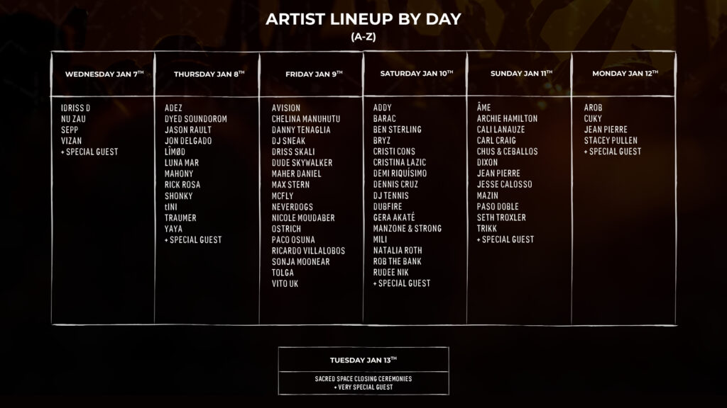 Más allá de la pista de baile, The 5th Element presenta Sacred Space, un santuario de bienestar curado por Above & Below Collective que actúa como el corazón espiritual del festival. Este espacio dedicado acogerá ceremonias, talleres guiados y sesiones de integración facilitadas por profesionales de diferentes tradiciones. Los asistentes tendrán acceso a prácticas diseñadas para fomentar la presencia, la conexión con el cuerpo y la sanación colectiva, con participación opcional disponible a través de paquetes combinados, experiencias adicionales y actividades basadas en donaciones. Sacred Space refuerza la filosofía central del festival: la celebración y la contemplación pueden convivir en armonía, ofreciendo a los asistentes un lugar para reconectar consigo mismos, con los demás y con la tierra entre actuaciones musicales.
